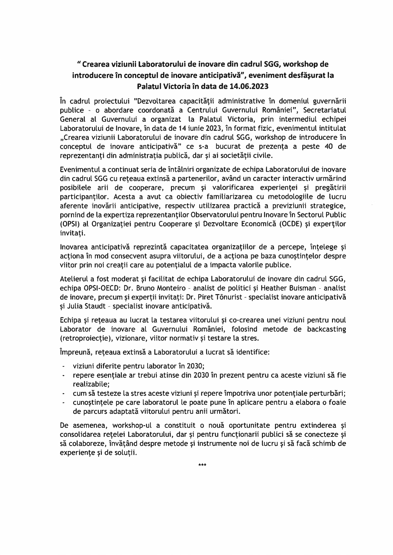 14.06.2023 – Press release – “Creating the vision of the Innovation Laboratory within SGG, introduction workshop to the concept of anticipatory innovation” by s | Aug 28, 2023 | Press Release Comunicat -“Crearea viziunii Laboratorului de inovare din cadrul SGG, workshop de introducere în conceptul de inovare anticipativă” Descarcă Comunicat -“Crearea viziunii Laboratorului de inovare din cadrul SGG, workshop de introducere în conceptul de inovare anticipativă”