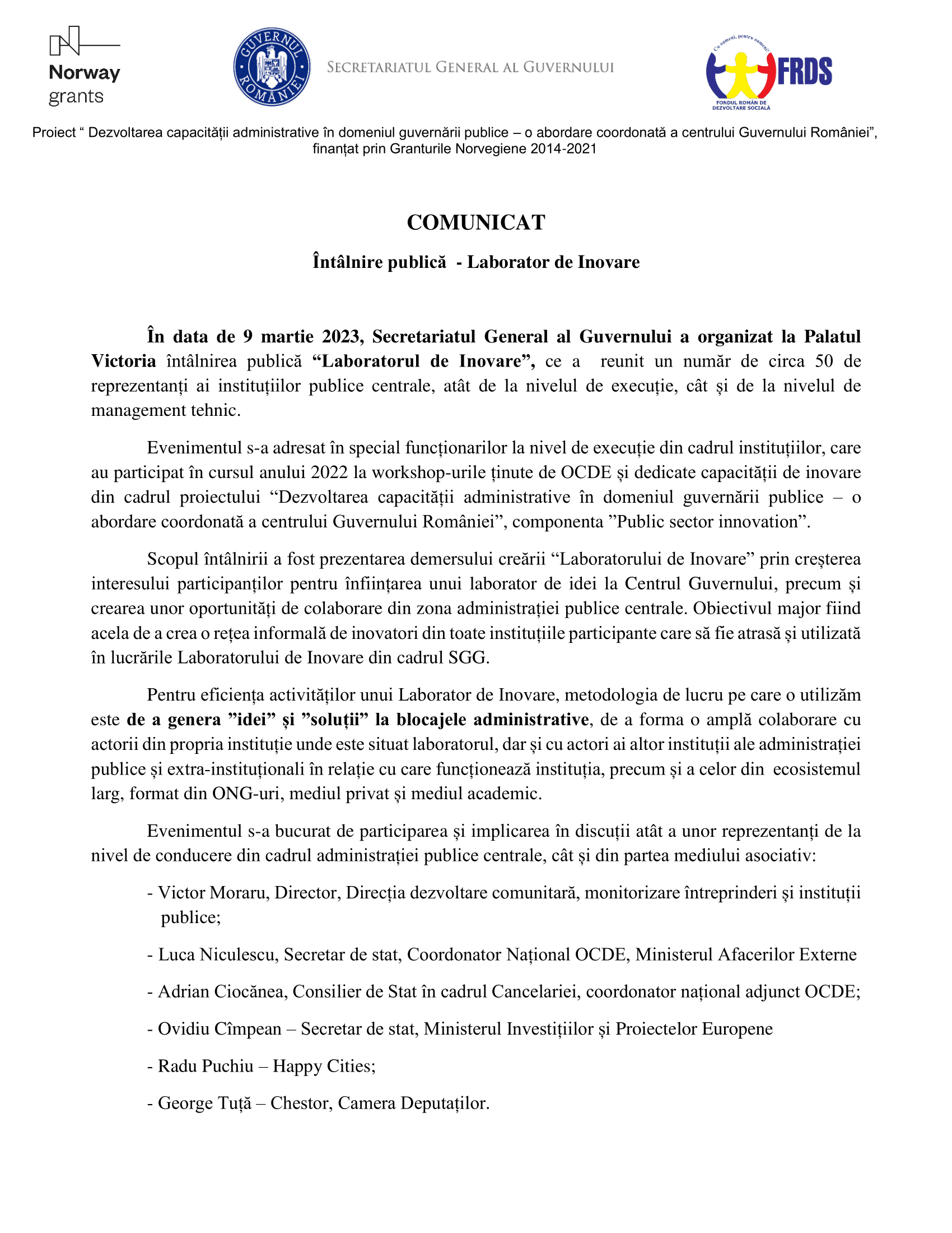 15.03.2023 – Press release – Public meeting – Innovation Laboratory by s | Aug 28, 2023 | Press Release Comunicat – Întâlnire publică – Laborator de Inovare, organizat în data de 9 martie 2023 Descarcă Comunicat – Întâlnire publică – Laborator de Inovare, organizat în data de 9 martie 2023