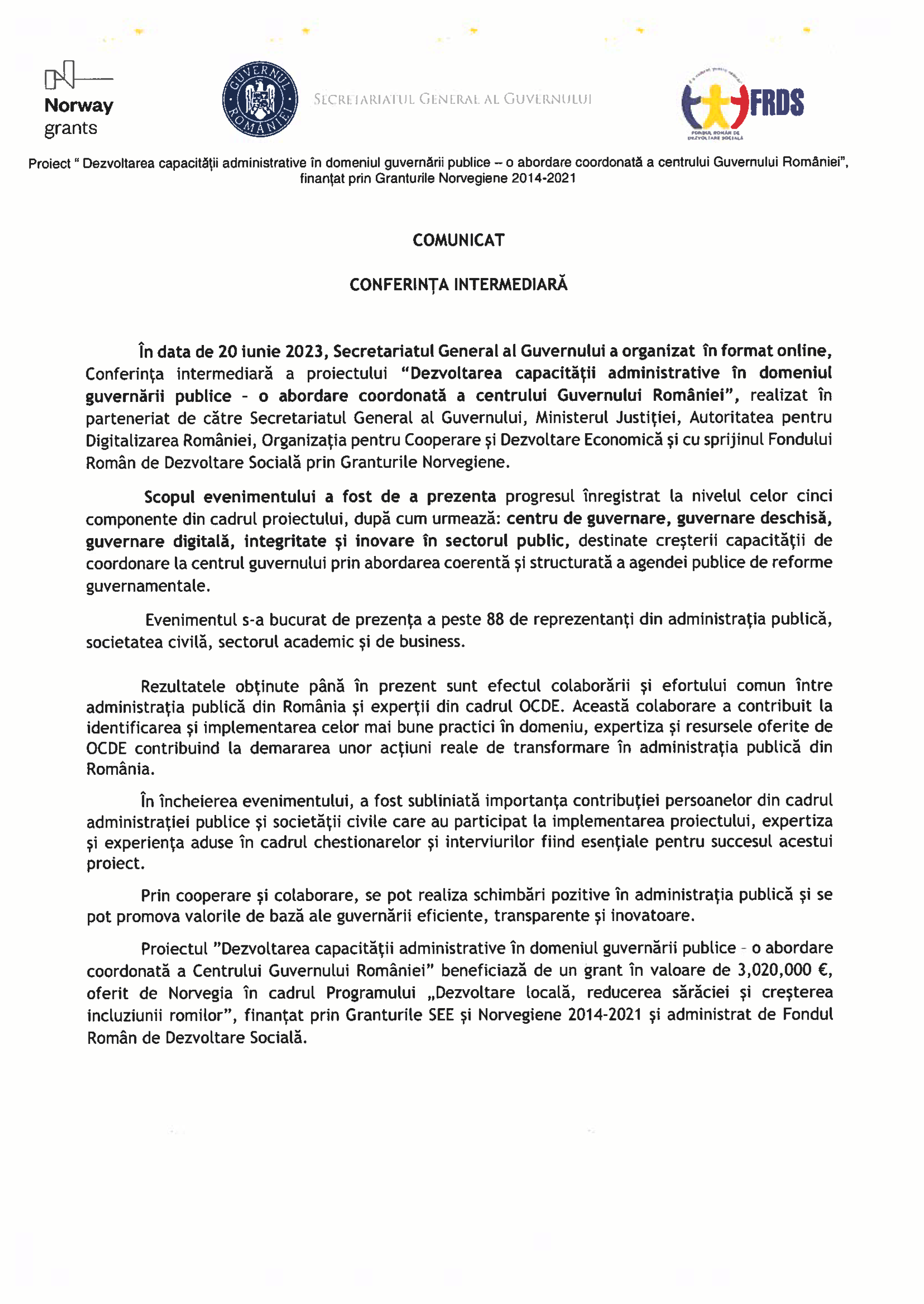 20.06.2023 – Press release – Interim conference – On June 20, 2023, the General Secretariat of the Government organized in online format, the Interim Conference of the project “Development of administrative capacity in the field of public governance – a coordinated approach of the center of the Government of Romania”